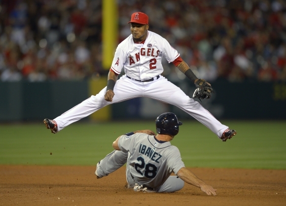 Ani tento odvážny sklz nepomohol basebalovému hráčovi Raulovi Ibanezovi zo Seattlu pred vyautovaním v zápase proti Los Angeles Angels. Foto: SITA/AP