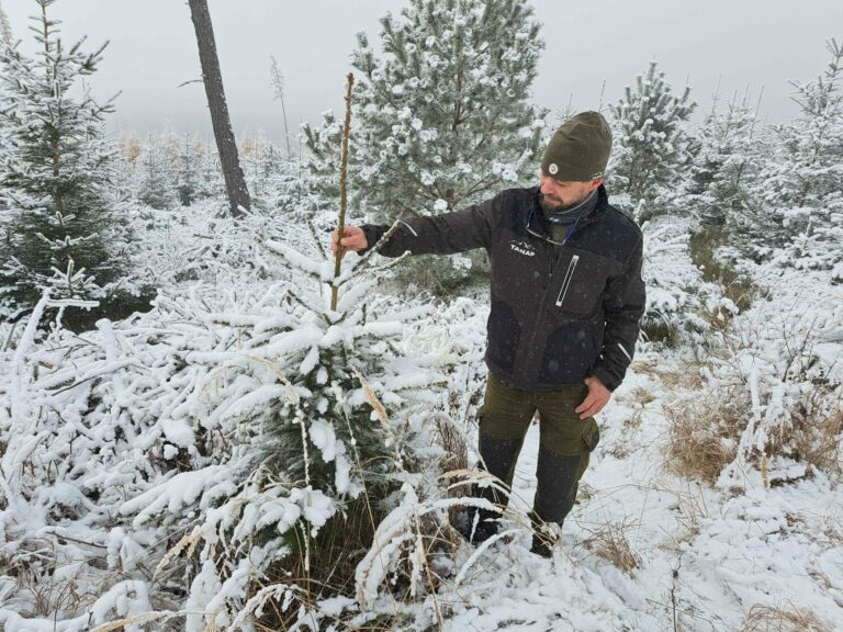 Vedúci ochranného obvodu Tatranské Matliare zo Správy Tatranského národného parku (TANAP) Pavol Spitzkopf pri stromčeku vysadenom v lokalite so zásahovou činnosťou po dvadsiatich rokoch od víchrice Alžbeta, ktorá sa prehnala Vysokými Tatrami. Vysoké Tatry, 14. november 2024. Foto: SITA/Mária Frisová