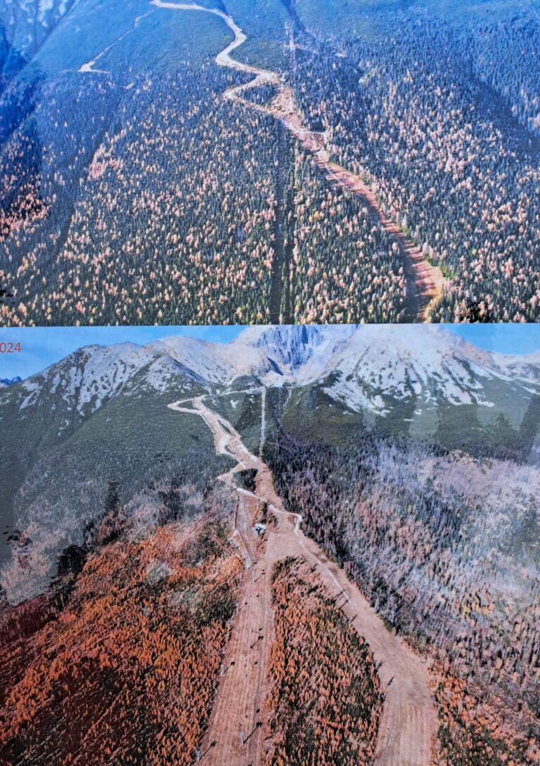 Ukážka rozdielu podoby lesa v ochrannom obvode Tatranské Matliare na území Tatranského národného parku (TANAP) rok po veternej kalamite v roku 2005 (hore) a v roku 2024 (dole), kde sa vľavo nachádza lokalita po zásahovej činnosti a vpravo bezzásahová. Vysoké Tatry, 14. november 2024. Foto: SITA/Mária Frisová