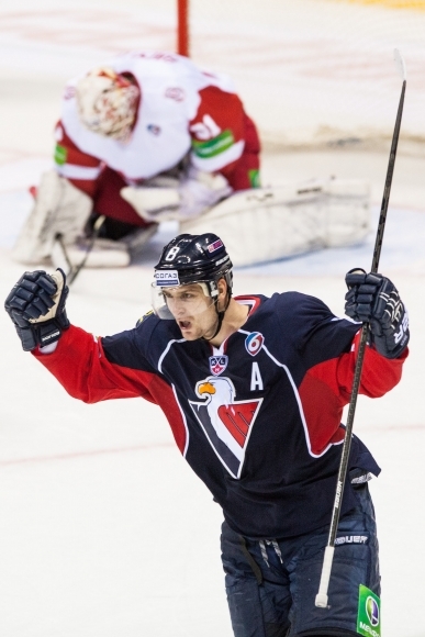 Darmo sa Slovanisti tešili po góle do siete Viťazu Podolsk. Ten v Bratislave vyhral 4:1 a Slovan sa v tabuľke Západnej divízie KHL prepadol opäť na posledné miesto. Foto: SITA/Jozef Jakubčo