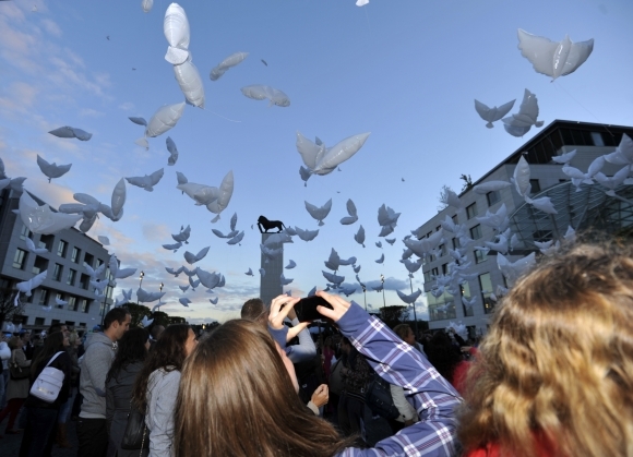 Účastníci bratislavského charitatívneho podujatia - vypúšťania balónových holubíc pri príležitosti Dňa želaní, na ktorom účastníci vypustili do vzduchu približne 750 nafukovacích holubíc. Foto: SITA/Ján Slovák