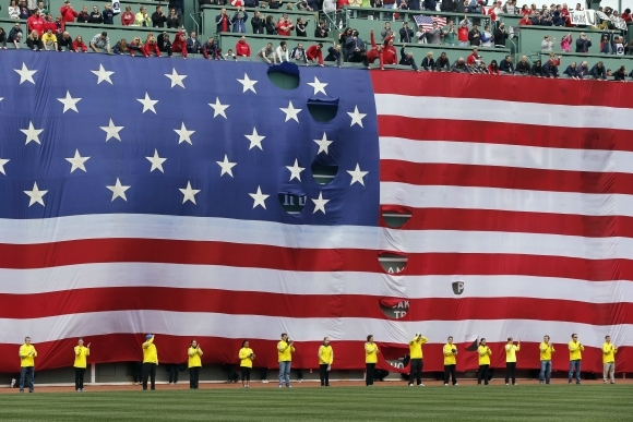 Dobrovoľníci z Bostonského maratónu stoja pred vlajkou počas minúty ticha za obete minulotýždňových teroristických útokov. Foto: SITA/AP Photo/Michael Dwyer