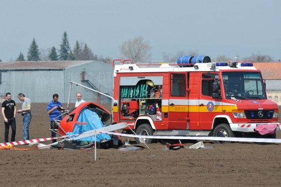 Neďaleko trnavského letiska Aero klubu sa zrútil vrtuľník, zomrel jeden človek, druhý utrpel zranenia. Na mieste nehody zasahujú hasiči. Na vrtuľníku vykonali protipožiarne opatrenia a momentálne z vraku vyslobodzujú mŕtvu osobu, ktorá zostala po páde zakliesnená vo vnútri. Foto: SITA/Ivan Kopčáni