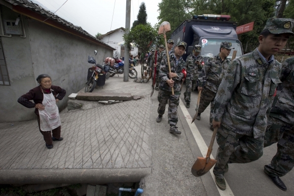 Tisícky záchranárov v nedeľu prehľadávali trosky zrútených budov v čínskej provincii Sečuan, ktorú v sobotu zasiahlo ničivé zemetrasenie. Počet obetí medzitým pravdepodobne už presiahol číslo 200 . Pracovníci oblečení do oranžových reflexných uniforiem pátrajú po stovkách nezvestných, ktorí uviazli vo svojich príbytkoch v dôsledku zosuvov pôdy. Do oblasti pricestoval aj premiér Li Kche-čchjang - štátna televízna stanica CCTV odvysielala zábery, ako v spoločnosti záchranárov obeduje v jednom z provizórnych stanov. Foto: SITA/AP Photo/Ng Han Guan