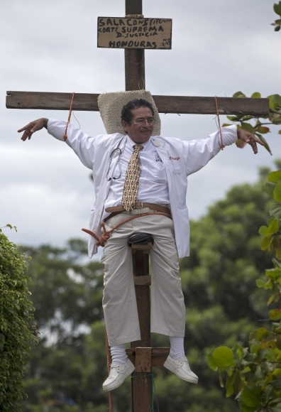 Politik Francisco Pagoada visí/sedí na kríži na protest proti tomu, že mu súd nedovolil uchádzať sa ako nezávislému kandidátovi o post starostu mesta Tegucigalpa v Hondurase. Foto: SITA/AP