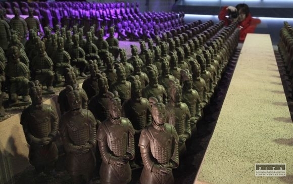 Známych čínskych terakotových bojovníkov, ale z čokolády si mohli odfotiť novinári pri príležitosti podujatia World Chocolate Wonderland venovaného zázračnému svetu čokolády, ktoré otvoria 29. januára v známom olympijskom Vtáčom hniezde v Pekingu. Okrem iného návštevníci uvidia aj sladký Veľký čínsky múr, či auto z čokolády. Foto: SITA