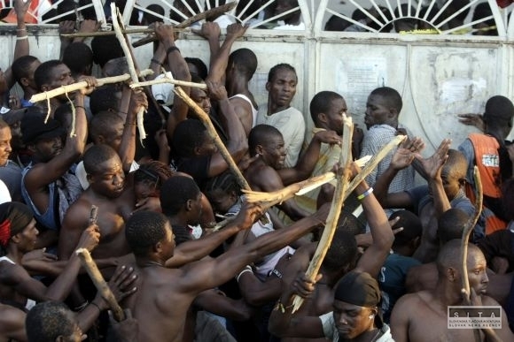 Skupina mužov palicami zaútočila na potravinové distribučné centrum riadené nadáciou Eagle Wings Foundation z Floridy. Davu sa podarilo preniknúť do skladu so zásobami na predmestí Port-au-Prince. Foto: SITA