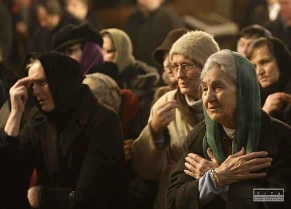 Veriaci Srbskej pravoslávnej cirkvi na liturgii v kostole v Belehrade. V piatok má 44-členná Posvätná synoda zvoliť 45. patriarchu Srbskej pravoslávnej cirkvi. Foto: SITA