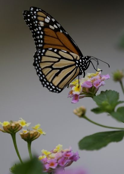 Motýľ Monarch pristáva na kvet v americkom meste San Antonio. Veľké množstvo týchto motýľov, ktoré majú rozpätie krídel až 9 cm, sa na zimu bežne sťahuje na juh do zalesnených častí Mexika. Podľa ochranárov však bola v tejto krajine v posledných rokoch vyrúbaná zhruba polovica lesov, do ktorých sa motýle uchyľovali. Foto: SITA/AP