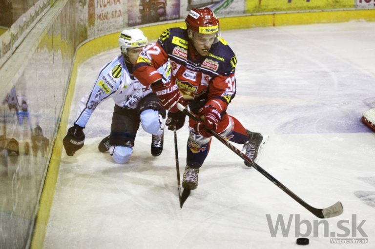 Zľava: Václav Čížek z Banskej Bystrice a Peter Sojčík z Košíc počas 23. kola hokejovej Tipsport extraligy v zápase medzi HC Košice - HC'05 Banská Bystrica. Košice, 16. november 2014. Foto: SITA/Tibor Zmak