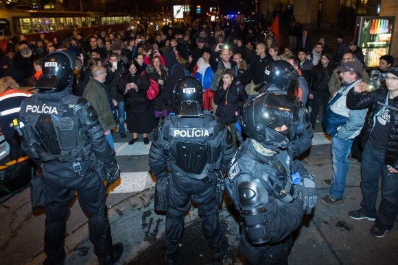 Účastníci protestného pochodu, blokády hlavného mesta s názvom SlobodnýObčan.sk, pochodovali ulicami Bratislavy. Výsledkom agresívneho protestu je 18 predvedených osôb a traja zranení. Foto: SITA/Jozef Jakubčo