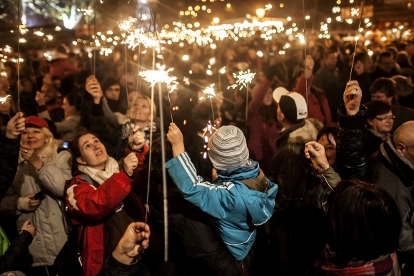 Vianočné trhy na Hviezdoslavovom námestí v Bratislave v piatok odštartovali prskavkovým rekordom. Naraz sa rozžiarilo 2000 prskaviek a Staré Mesto sa tak zapísalo do Knihy slovenských rekordov. Trhy budú otvorené budú do 23. decembra. Foto: SITA/Gabriel Kuchta