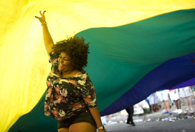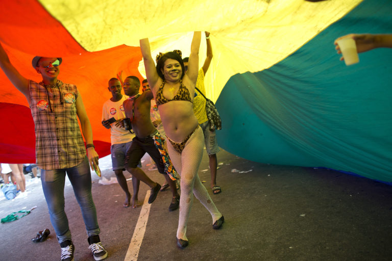 Ľudia tancujú pod dúhovou vlajkou počas Gay Pride Parade v Rio de Janeiro. Foto: SITA/AP