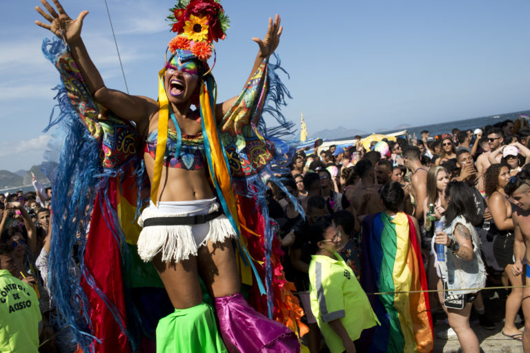 Umelkyňa tancuje v kostýme počas Gay Pride Parade v Rio de Janeiro. Foto: SITA/AP