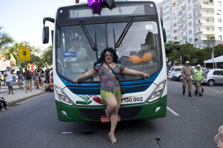 Účastník pózuje pred autobusom jeho skupiny počas Gay Pride Parade v Rio de Janeiro. Foto: SITA/AP