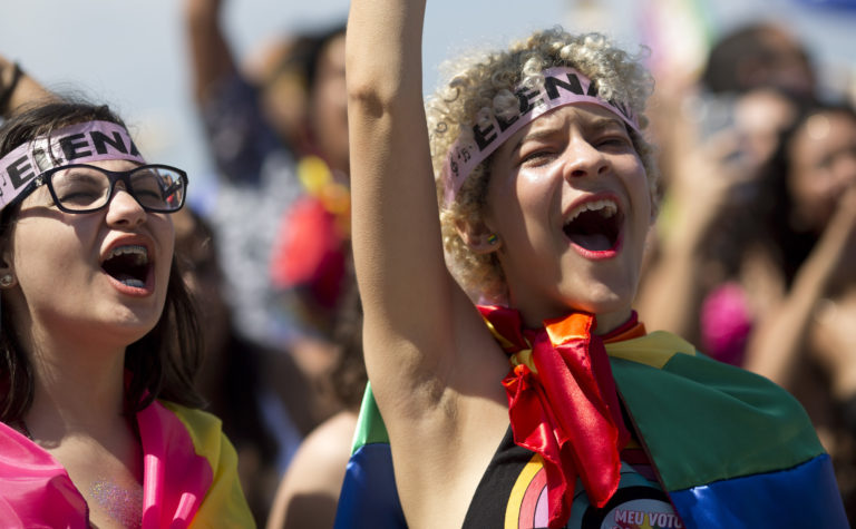 Účastníci protestujú proti Jairovi Bolsonarovi, prezidentskému kandidátovi za Nacionálnu sociálnu liberálnu stranu, počas Gay Pride Parade v Rio de Janeiro. Foto: SITA/AP