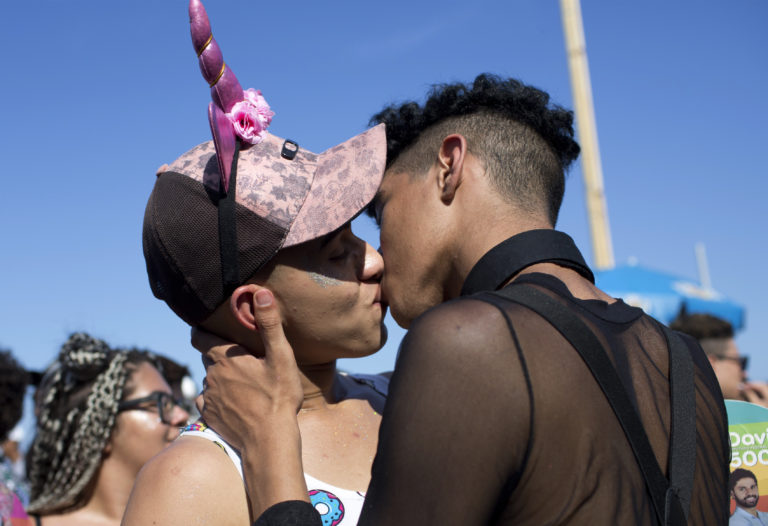 Bozkávajúci sa pár na Gay Pride Parade v Rio de Janeiro. Foto: SITA/AP
