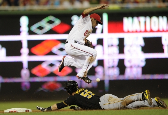 Pittsburghský basebalista Russell Martin s číslom 55 získava druhú métu aj vďaka akrobatickému kúsku súpera Anthonyho Rendona z Washingtonu. Foto: SITA/AP