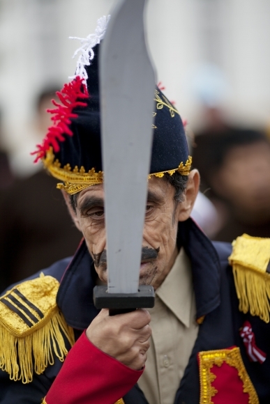 Julio Peliaranda v kostýme peruánskeho hrdinu Jose de San Martina na prehliadke, ktorú pri príležitosti tamojšieho Dňa nezávislosti usporiadali pacienti psychiatrickej liečebne v Lime. Foto: SITA/AP