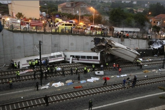 Na severozápade Španielska sa pravdepodobne v dôsledku vysokej rýchlosti v stredu večer pri príchode do pútnického mesta Santiago de Compostela vykoľajil vlak. Pri nešťastí zahynulo najmenej 77 pasažierov, zranených je ďalších 143 ľudí Foto: SITA/AP