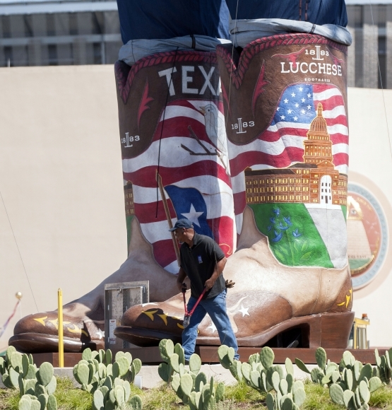 Mestský zamestnanec pracuje okolo sochy Bid Tex v Dallase. Takmer 17-metrová postava je symbolom tohto amerického štátu. Veľký Texasan sa vrátil na svoje miesto vo štvrtok po dlhšej pauze, keďže na konci vlaňajšieho veľtrhu skončil v plameňoch. Foto: SITA/AP