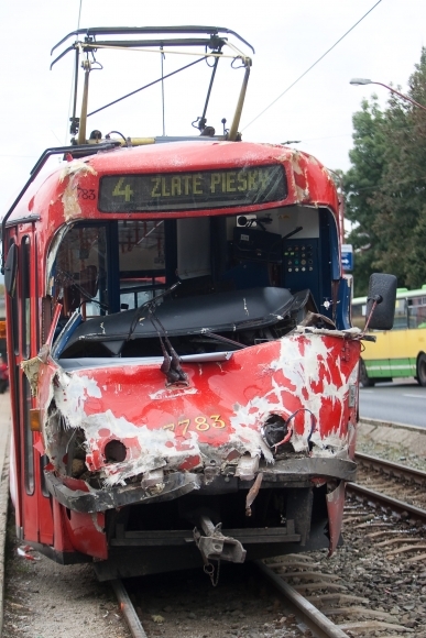 Pri štvrtkovej zrážke dvoch električiek na nábreží v Bratislave sa zranil vodič a 11 cestujúcich. Električka nestihla pred zastávkou Lafranconi zastaviť a vrazila do druhej, ktorá stála na zastávke. Jeden z vodičov má otras mozgu, viaceré pomliaždeniny a tržné rany, jeho stav je však stabilizovaný. Cestujúci mali pomliaždeniny, rezné rany, ktoré si vyžadovali šitie, doudieranú chrbticu, hlavu, hrudník a brucho. Príčiny nehody ešte nie sú známe. Foto: SITA/Gabriel Kuchta