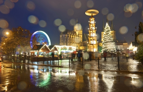 Tradičné jesenné upršané počasie si užili návštevníci vianočných trhov v nemeckom Frankfurte nad Mohanom. Foto: SITA/AP Photo/Jens Meyer