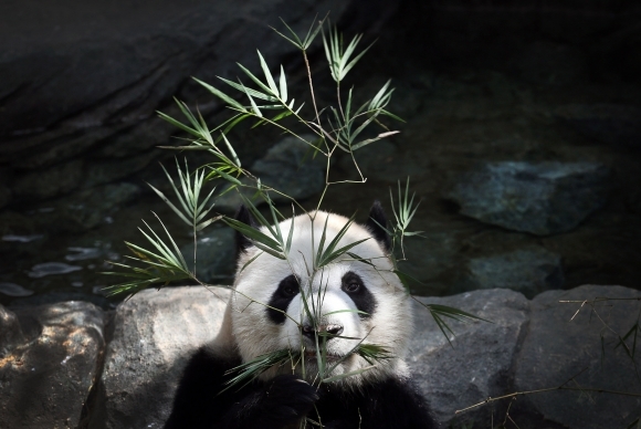 Samička pandy Kai Kai si pochutnáva na dobrom obede v prírodnej rezervácií v Singapure. Kai Kai je jednou z dvoch pánd, ktoré majú byť novou atrakciou pre návštevníkov krajiny od roku 2013. Foto: SITA/AP Photo/Wong Maye-E
