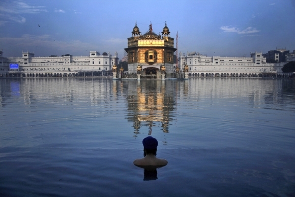 Indický muž sa kúpe v jazere pred Zlatým chrámom, najpôsvätnejším miestom vyznávačov Sikhizmu, v indickom Amritsare. Foto: SITA/AP Photo/Sanjeev Syal