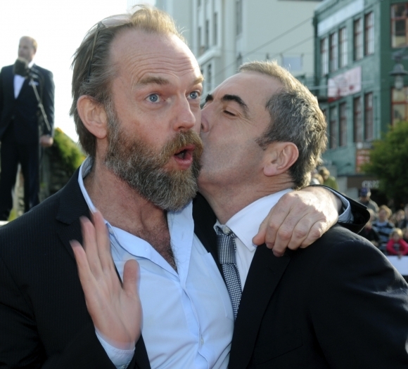Herec Hugo Weaving dostáva "sladký bozk" od svojho kolegu Huga Weavinga počas príchodu na premiéru veľkofilmu Hobit: Neočakávaná cesta v novozélandskom Wellingtone. Foto: SITA/AP Photo/SNPA, Ross Setford