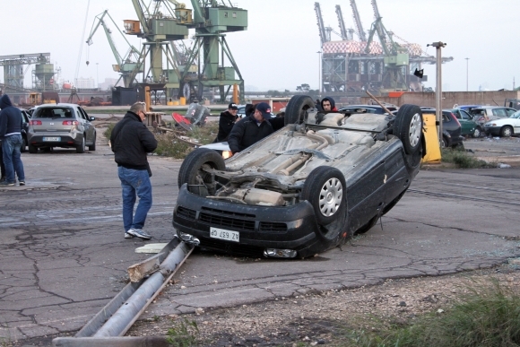 Oceliareň v juhotalianskom Tarente, ktorá momentálne zápasí s existenčnými problémami, v stredu zasiahlo silné tornádo. Výsledkom je 20 ľahko zranených a jeden nezvestný pracovník ako aj značné materiálne škody. Podľa vyjadrenia hovorcu miestneho starostu pre tlačovú agentúru AFP po nezvestnom pátrajú potápači, keďže zrejme obsluhoval žeriav, ktorý vietor strhol do mora. Foto: SITA/AP Photo/Lapresse