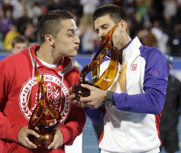 Víťazom 5. ročníka prestížneho exhibičného tenisového podujatia Mubadala World Tennis Championship v Abú Zabí v Spojených arabských emirátoch sa stal Srb Novak Djokovič (na snímke vpravo), ktorý vo finále zdolal Nicolása Almagra zo Španielska 6:7 (4), 6:3, 6:4. Zverenec Mariána Vajdu Djokovič obhájil triumf z vlaňajška a získal prémiu 250 000 dolárov. Foto: SITA/AP Photo/Kamran Jebreili