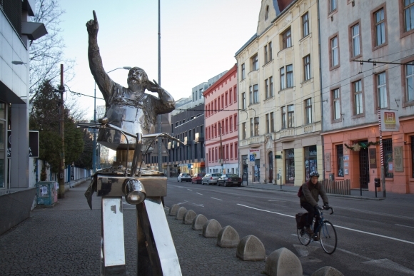 Socha s podobizňou herca, komika a spisovateľa Júliusa Satinského na bratislavskej Dunajskej ulici. 29. december patrí spomienke na desať rokov od odchodu Júliusa Satinského. Foto: SITA/Ľudovít Vaniher