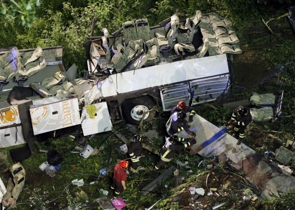 Najmenej 36 ľudí prišlo v nedeľu večer o život a ďalších 11 bolo zranených pri havárii autobusu na juhu Talianska. Ide o najhoršiu nehodu autobusu v Európe za posledné roky. Stala sa na diaľnici pri meste Avellino asi 50 kilometrov východne od Neapola. Vodič zatiaľ z neznámych príčin stratil kontrolu vo vysokej rýchlosti a autobus sa zrútil z nadjazdu po asi 30-metrovom svahu. Foto: SITA/AP