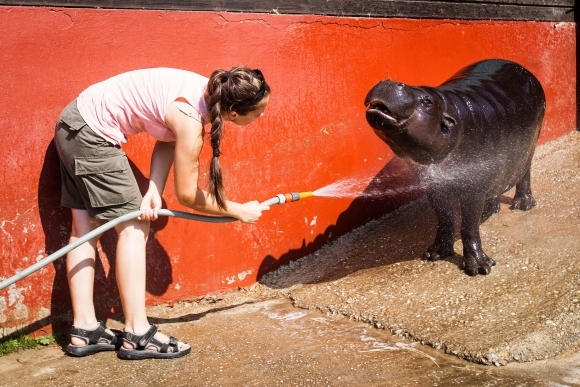 Pracovníčka ZOO Bratislava sprchuje zvieratá vodou v rámci opatrení pred vysokými teplotami. Na snímke hrošík libérijský (Hexaprotodon liberiensis). Foto: SITA/Jozef Jakubčo