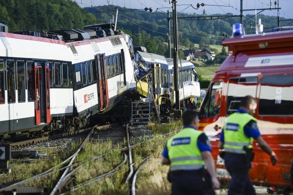 Neďaleko švajčiarskeho mesta Lausanne sa čelne zrazili dva vlaky. O život prišiel rušňovodič a ďalších 35 ľudí sa zranilo. Ku kolízii došlo približne 100 metrov od vlakovej stanice. Je to už tretia vážna dopravná nehoda v Európe v krátkom čase, po minulotýždňovom vykoľajení vlaku v Španielsku a pondelkovej nehode talianskeho autobusu. Foto: SITA/AP