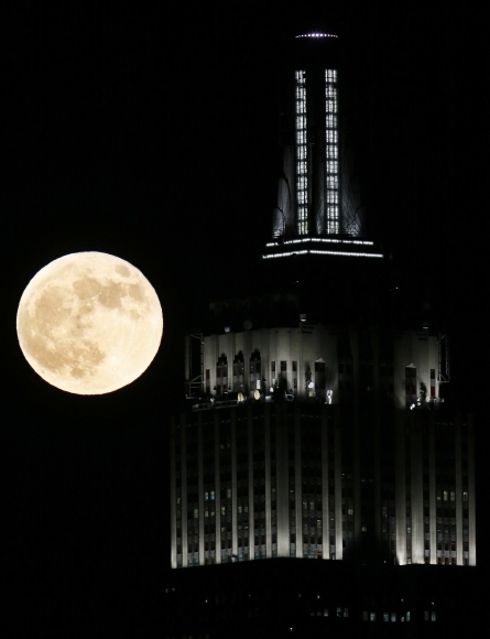 Obyvatelia a návštevníci amerického mesta Hoboken v štáte New Jersey si mohli dnes v noci vychutnať skutočne prekrásny pohľad na spln Mesiaca, ktorý osvetľoval newyorskú dominantu Empire State Building. Foto: SITA/AP Photo/Julio Cortez