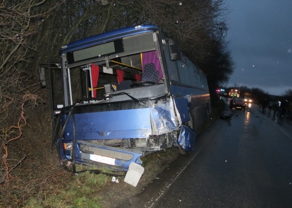 Dopravná nehoda pri Starej Turej v okrese Nové Mesto nad Váhom si vyžiadala jeden ľudský život. Nehoda sa stala dnes ráno pred 6:00. Osobné auto značky Audi 5 predbiehalo a nestihlo sa zaradiť. Čelne narazilo do autobusu, ktorý išiel z Nového Mesta nad Váhom. Šofér autobusu a cestujúci utrpeli ľahšie zranenia. V osobnom aute zahynul 31-ročný šofér zo Starej Turej. Foto: SITA/KR PZ Trenčín