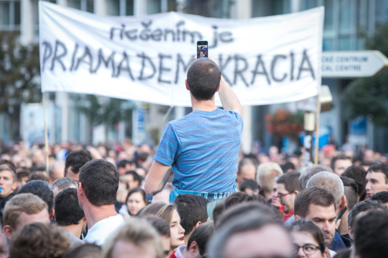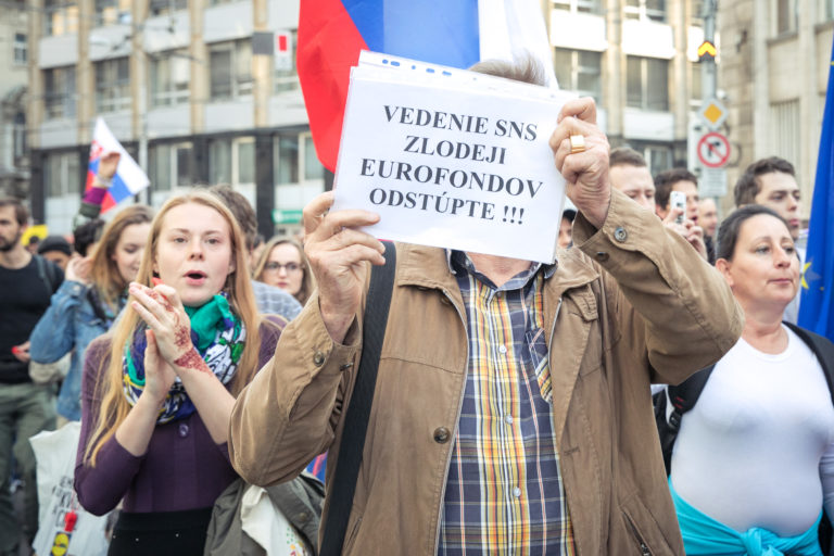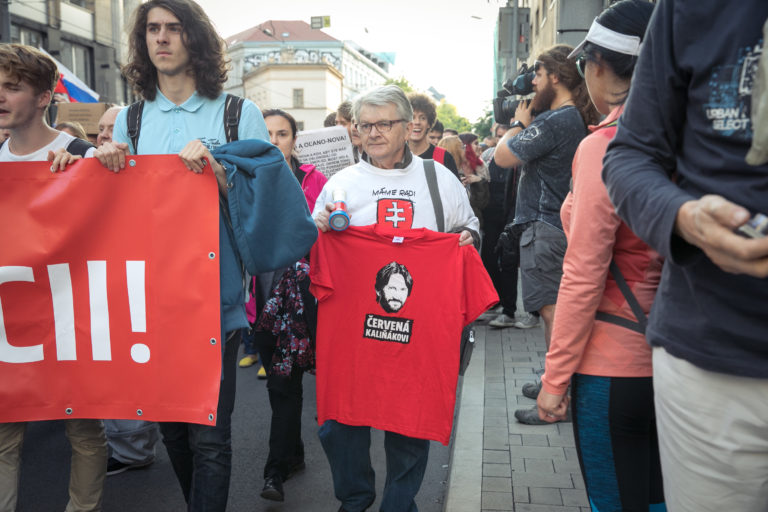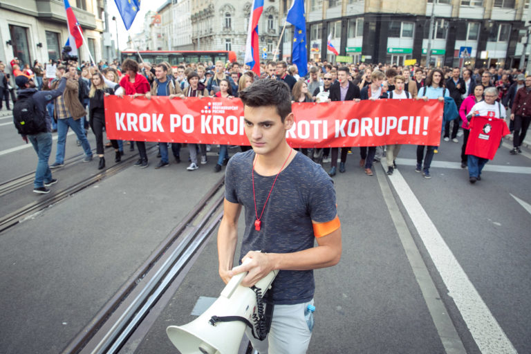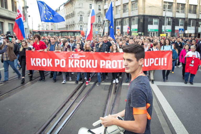 Účastníci 3. protikorupčného pochodu s názvom Zakročme spolu proti korupcii počas presunu z Hviezdoslavovho námestia na Námestie SNP. Bratislava, 25. september 2017. Foto: SITA/Diana Černáková