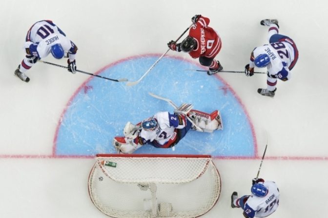 Tesné víťazstvo Kanady nad USA 2:1 sa zrodilo v nedeľňajšom stretnutí základnej "slovenskej" B-skupiny na majstrovstvách sveta hokejistov do 20 rokov v ruskej Ufe. Na snímke kanadský útočník Ryan Strome (18) skóruje do siete USA počas I. tretiny zápasu. Foto: SITA/AP Photo/The Canadian Press, Nathan