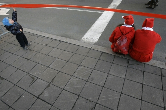 Malý chlapec sa hrá so stuhou pri účastníkoch 5. ročníka tradičného behu Santa Clausov srbským hlavným mestom Belehrad, ktorí oddychujú po vyčerpávajúcom výkone. Foto: SITA/AP Photo/Darko Vojinovic