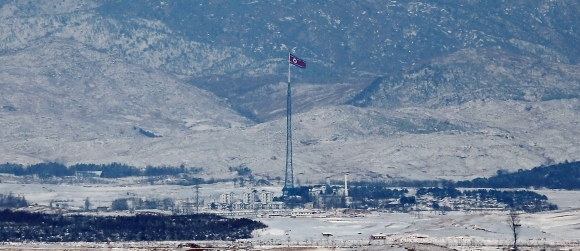 Vztýčená severokórejská zástava vlaje do vetra v dedine Panmunjom v demilitarizovanej zóne na hranici s Južnou Kóreou. Foto: SITA/AP Photo/Yonhap, Shin Jun-hee