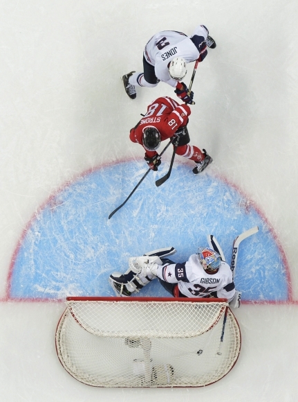 Tesné víťazstvo Kanady nad USA 2:1 sa zrodilo v nedeľňajšom stretnutí základnej "slovenskej" B-skupiny na majstrovstvách sveta hokejistov do 20 rokov v ruskej Ufe. Na snímke kanadský útočník Ryan Strome (18) skóruje do siete USA počas I. tretiny zápasu. Foto: SITA/AP Photo/The Canadian Press, Nathan