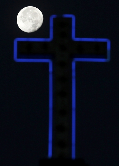 Pohľad na prekrásny spln mesiaca v nad krížom v mexickom meste Tepexpan na severovýchode krajiny. Foto: SITA/AP Photo/Julio Cortez