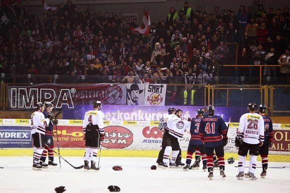 Tanner Glass z HC'05 Banská Bystrica (štvrtý zľava) počas 33. kola slovenskej hokejovej Tipsport extraligy 2012/2013 medzi Hkm Zvolen – HC'05 Banská Bystrica. Foto: SITA/Ján Viazanička