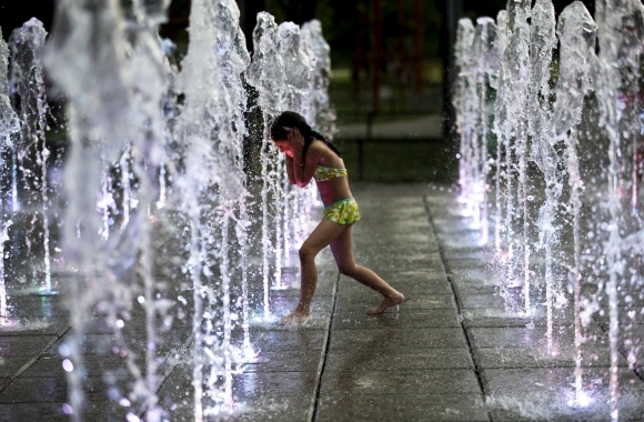 Dieťa si v Bukurešti užíva osvieženie pri fontánach. Južnú časť Rumunska tiež postihli extrémne horúčavy a teplota sa v niektorých oblastiach pohybuje okolo 40 stupňov Celzia. Foto: SITA/AP