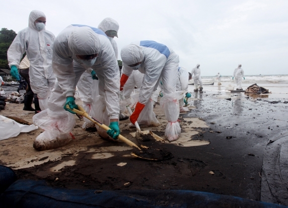Robotníci upratujú spúšť, ktorú spôsobila na thajskom ostrove Samet spôsobila uniknutá ropa. Do mora uniklo asi 50 ton "čierneho zlata" z potrubia pri pobreží provincie Rajong. Do boja s ropnou škvrnou sa zapojili stovky ľudí vrátane námorníctva. Turistov úrady vyzvali, aby sa v tejto oblasti vyhýbali plážam. Foto: SITA/AP