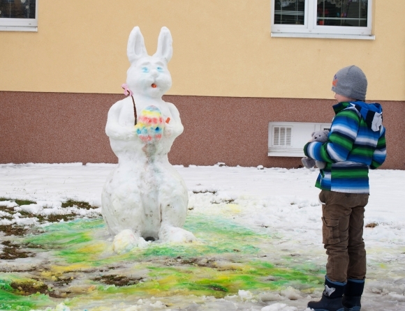Veľkonočný zajac zo snehu, ktorý je výtvorom obyvateľov staroturianskeho sídliska. Foto: SITA/Martin Medňanský