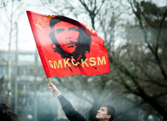 Účastníci protestu počas zhromaždenia za otvorenie múzea zločinov kapitalizmu, ktoré zorganizoval Socialistický zväz mladýcH v spolupráci s občianskymi združeniami na Námestí slobody v Bratislave. Foto: SITA/Diana Černáková