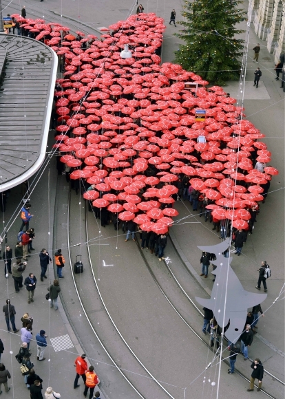 Švajčiarsky odborový zväz v piatok usporiadal v centre Zürichu. Demonštranti s červenými dáždnikmi vytvorili nadrozmerný obraz ryby, ktorá sa snaží zožrať žraloka. Protest mal poukázať na praktiky tzv. finančných žralokov v krajine. Foto: SITA/AP Photo/Keystone/Walter Bieri